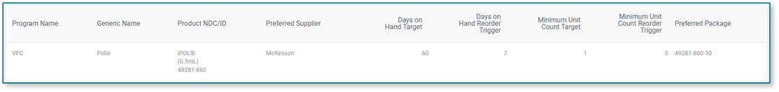 1 Minimum Unit Count Target: If IPOL never meets the days on hand usage, and the minimum unit count trigger value is reached, the reordering report will suggest 1 vial of IPOL quantity to reorder to reach the minimum unit count.