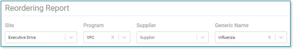The reordering report will provide all suggested order quantities for items that meet the values configured by program or by the item overrides. This report can be viewed, printed, or exported with all information to make reordering items easy for all sites.