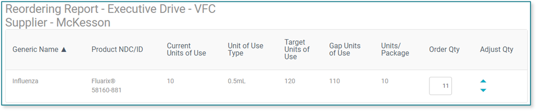 Order Qty: this is the suggested order quantity in package quantity for the item. A user can optionally change to their desired package quantity to order. The example displays that 11 packages of Fluarix (10 doses per package) should be reordered so there are enough doses on hand (120 doses) to meet 30 days on hand.