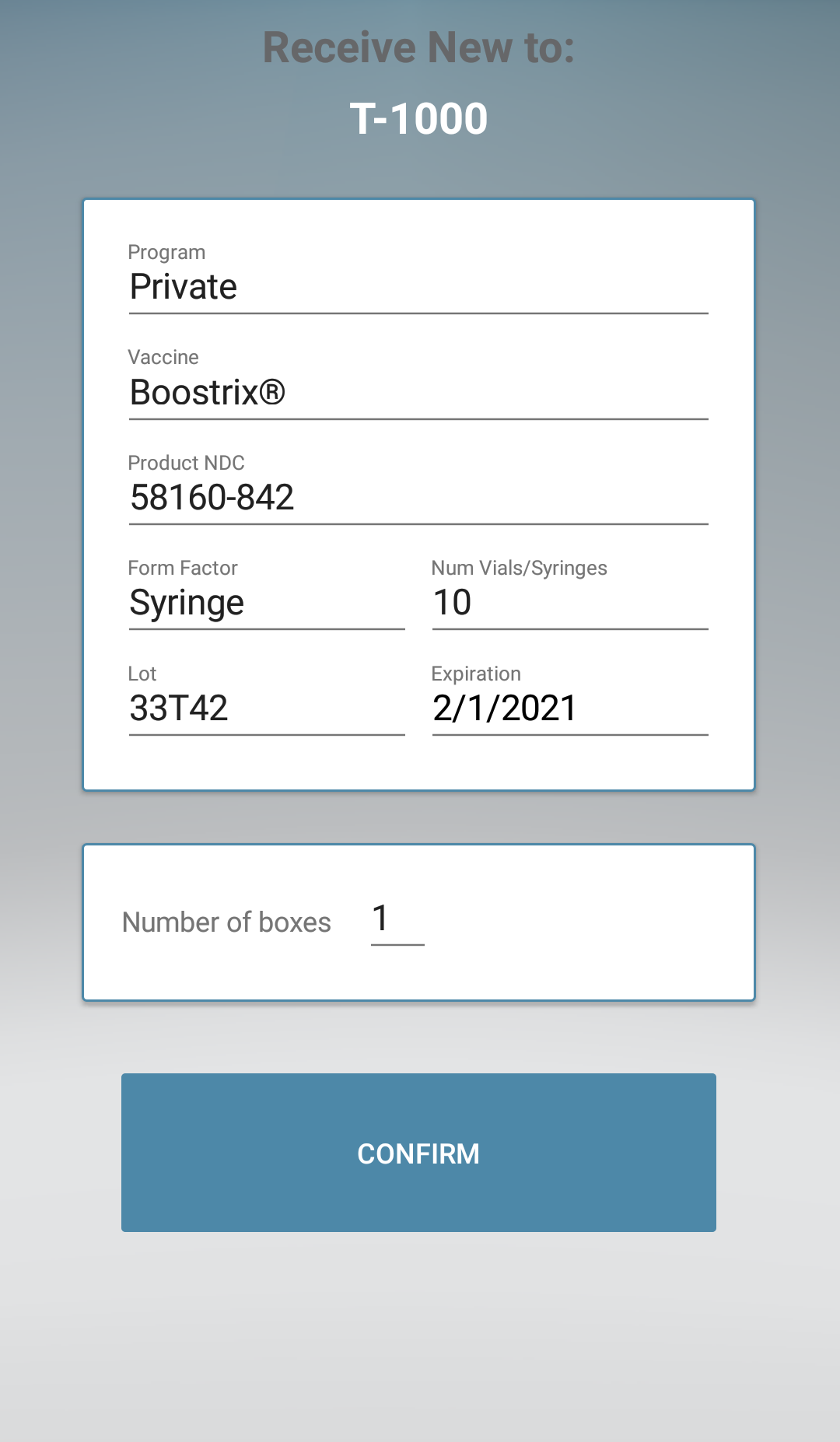- Pressing the ‘Confirm’ button will add that vaccine to inventory.