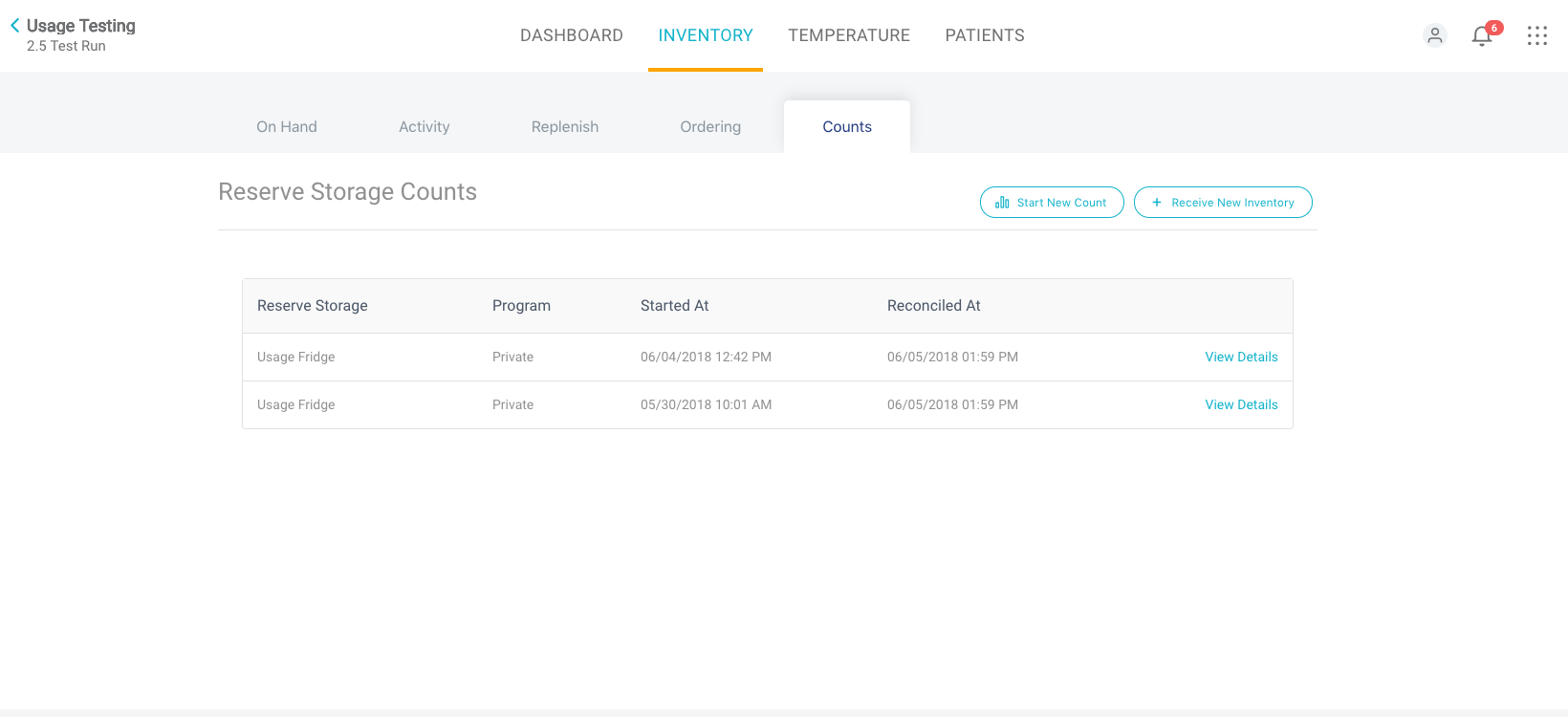 The Counts tab under the Inventory section provides two functions for the user as it relates to vaccine in Reserve Storage Units. A user can initiate a cycle count to ensure accuracy of vaccines in Reserves or they can add new vaccine to the practice to begin tracking.