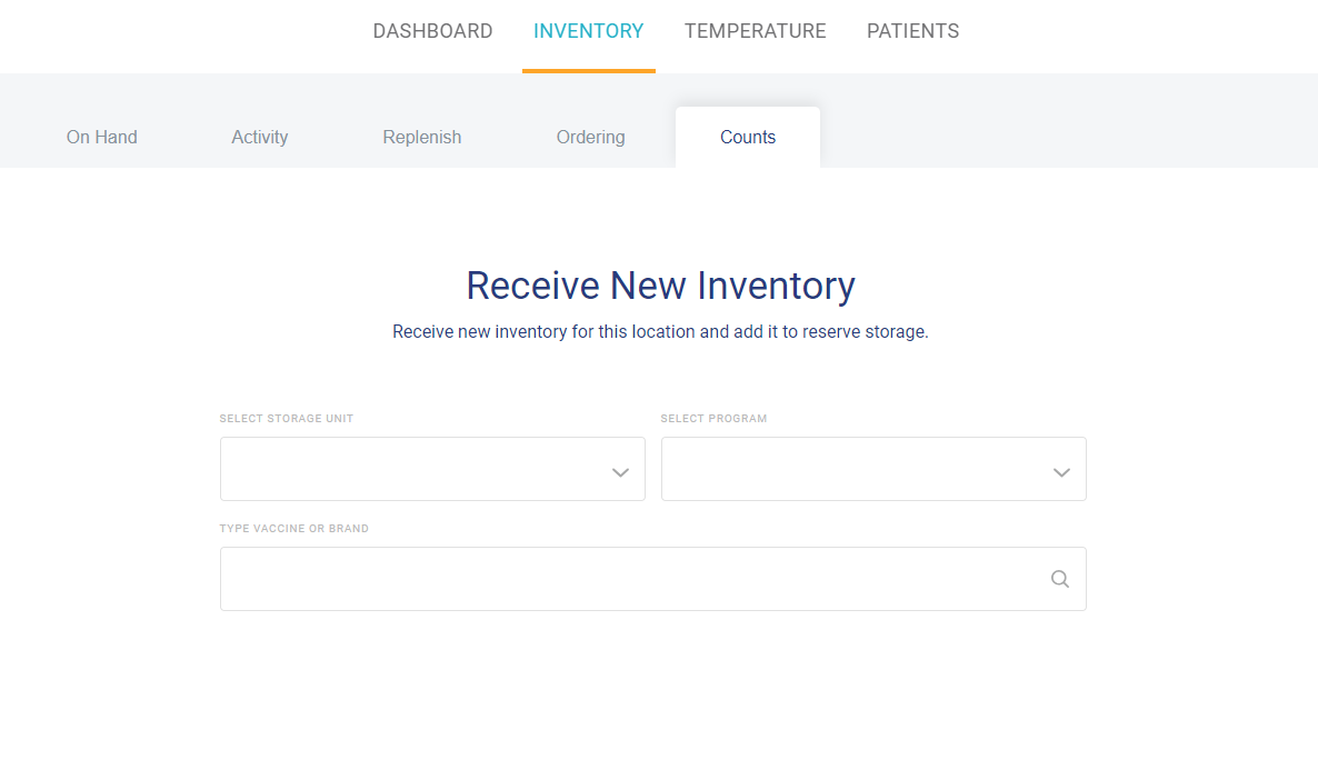 A user selects the “Receive New Inventory” button to begin the process. Simply follow the steps to select the Reserve Storage Unit the vaccine is located at, the Program the vaccine is assigned to, and begin typing the vaccine name or brand.