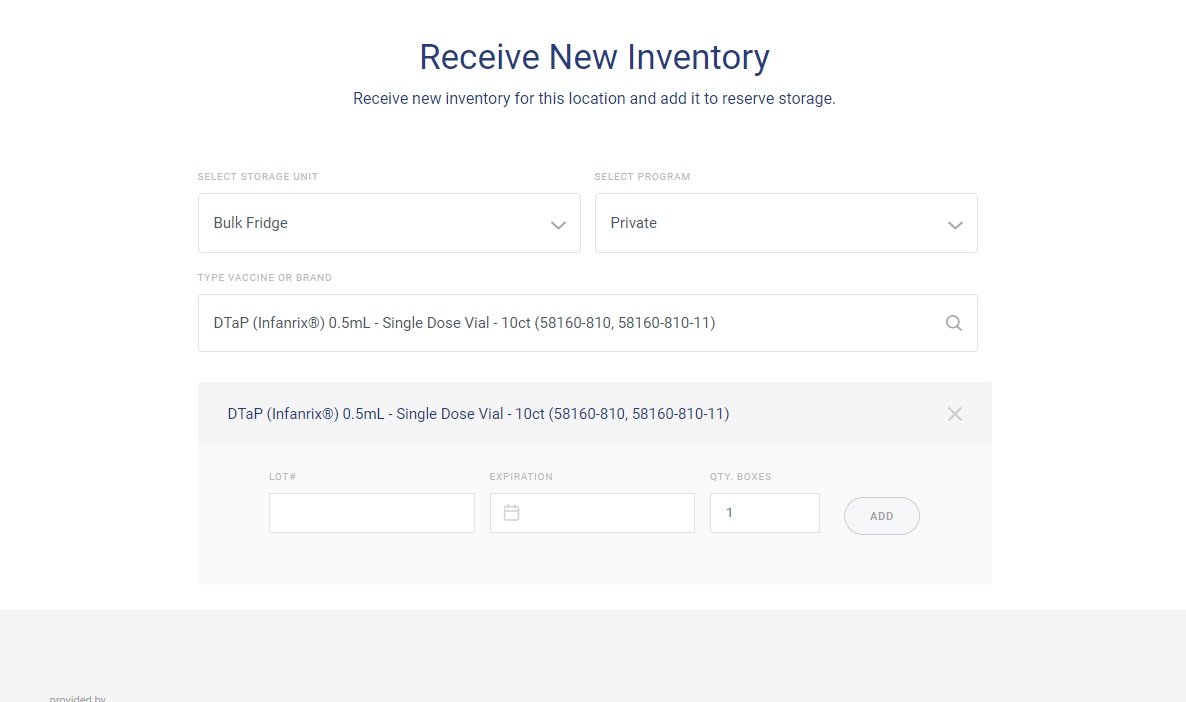 Once a vaccine is selected, the user is required to enter the Lot, Expiration Date, and quantity of boxes being added to inventory. Selecting “ADD” will add the vaccine to the list of vaccines to submit to inventory.