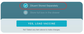 Located at the bottom of the screen there will be an option to select the Diluent Stored Separately. When enabled, AccuVax will track the active component only and the user can store the diluent outside of the AccuVax, such as on a shelf or cabinet.