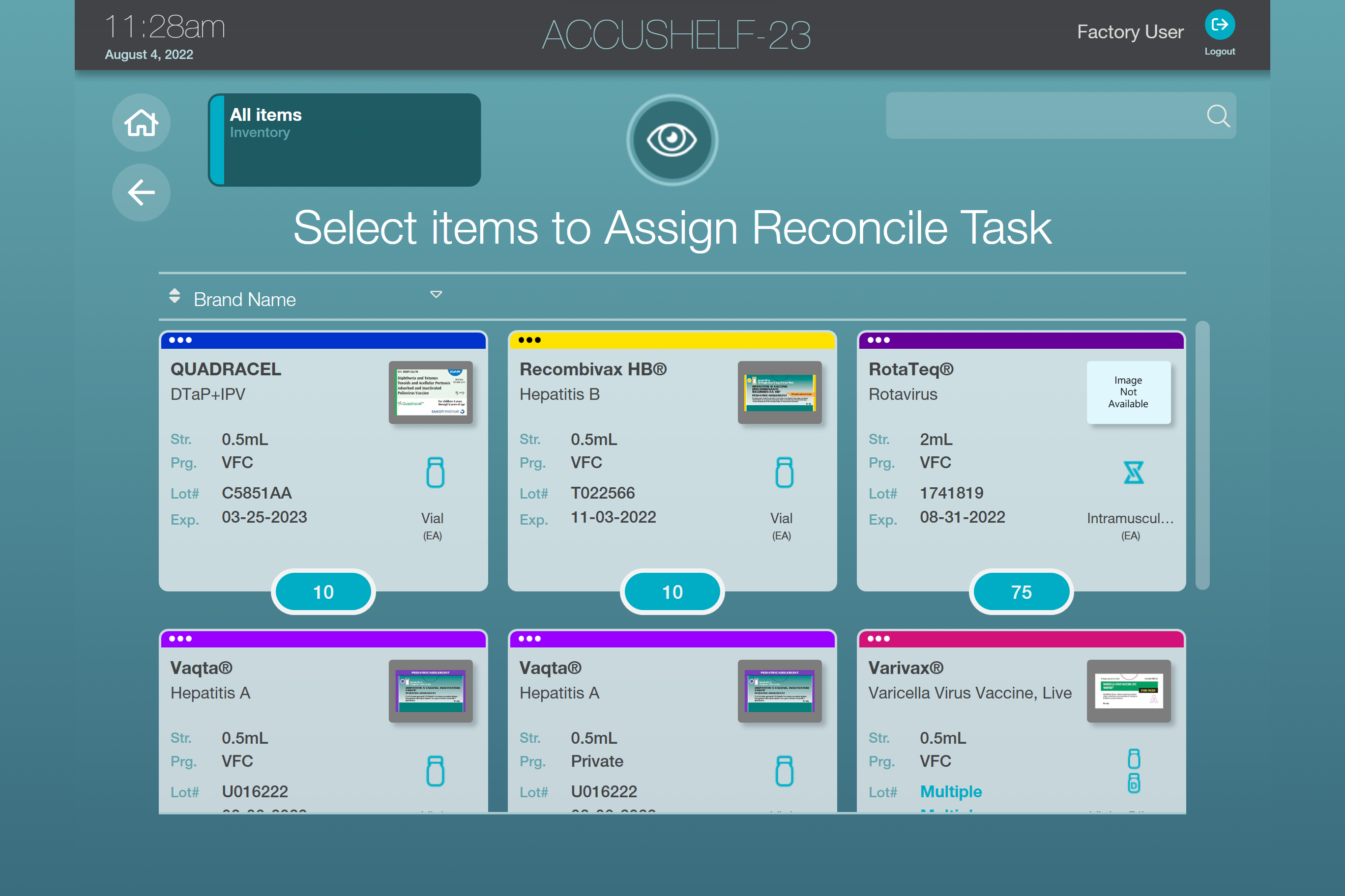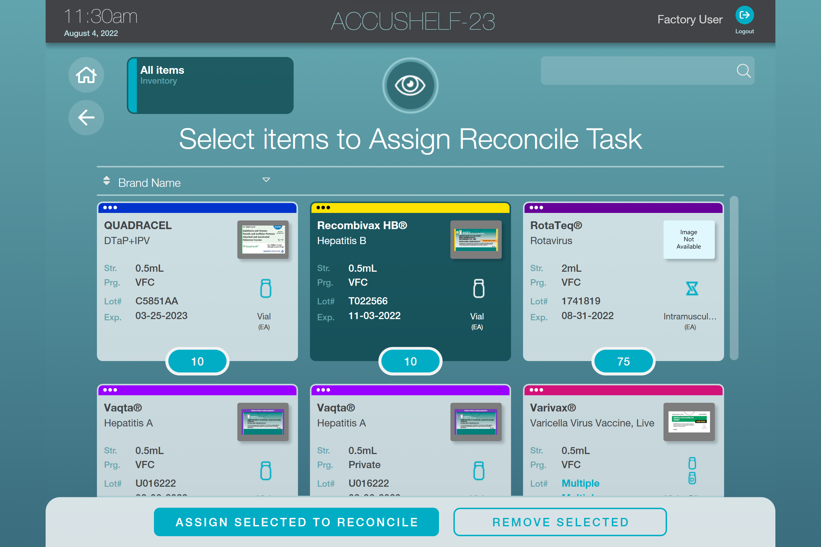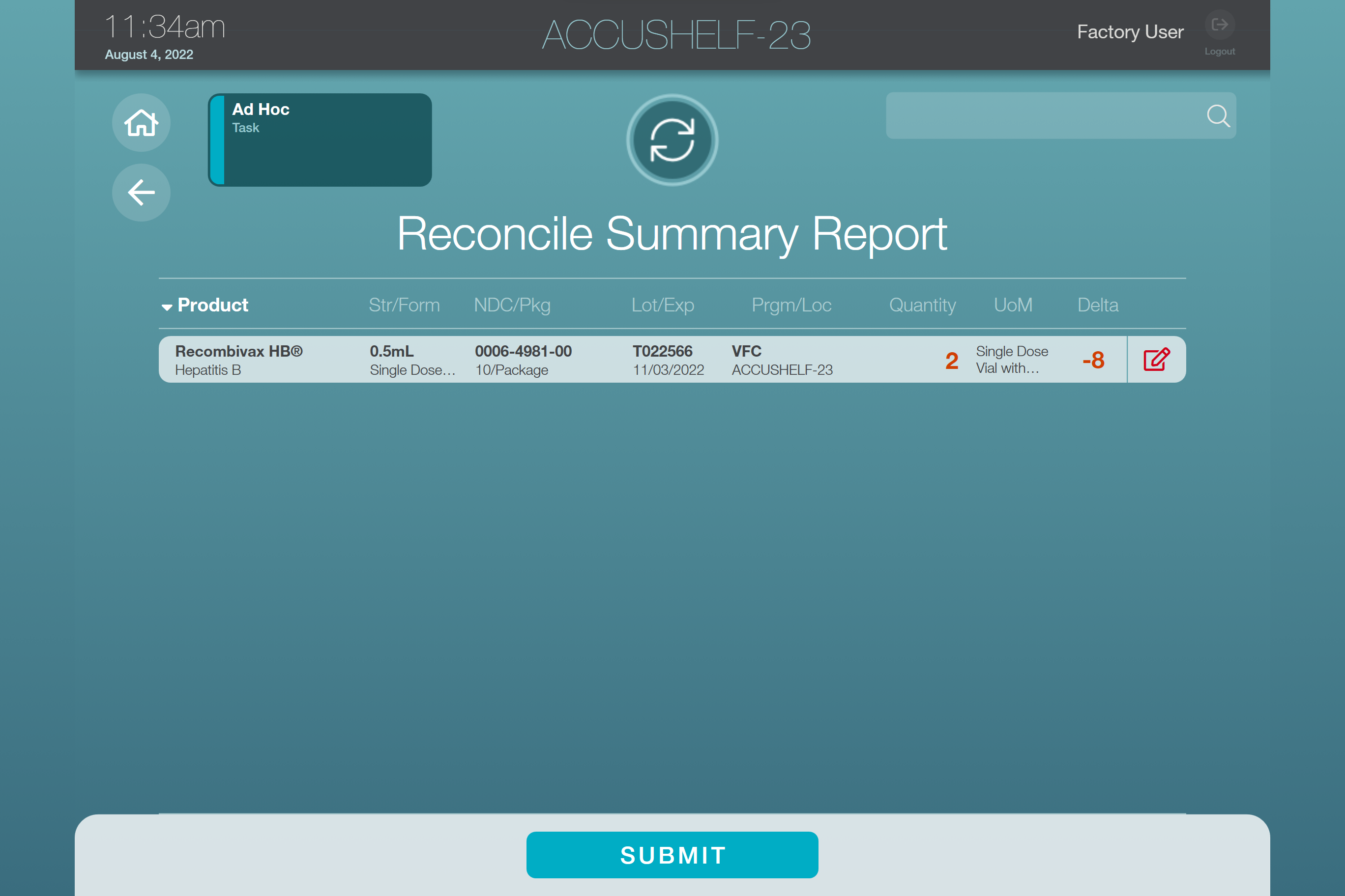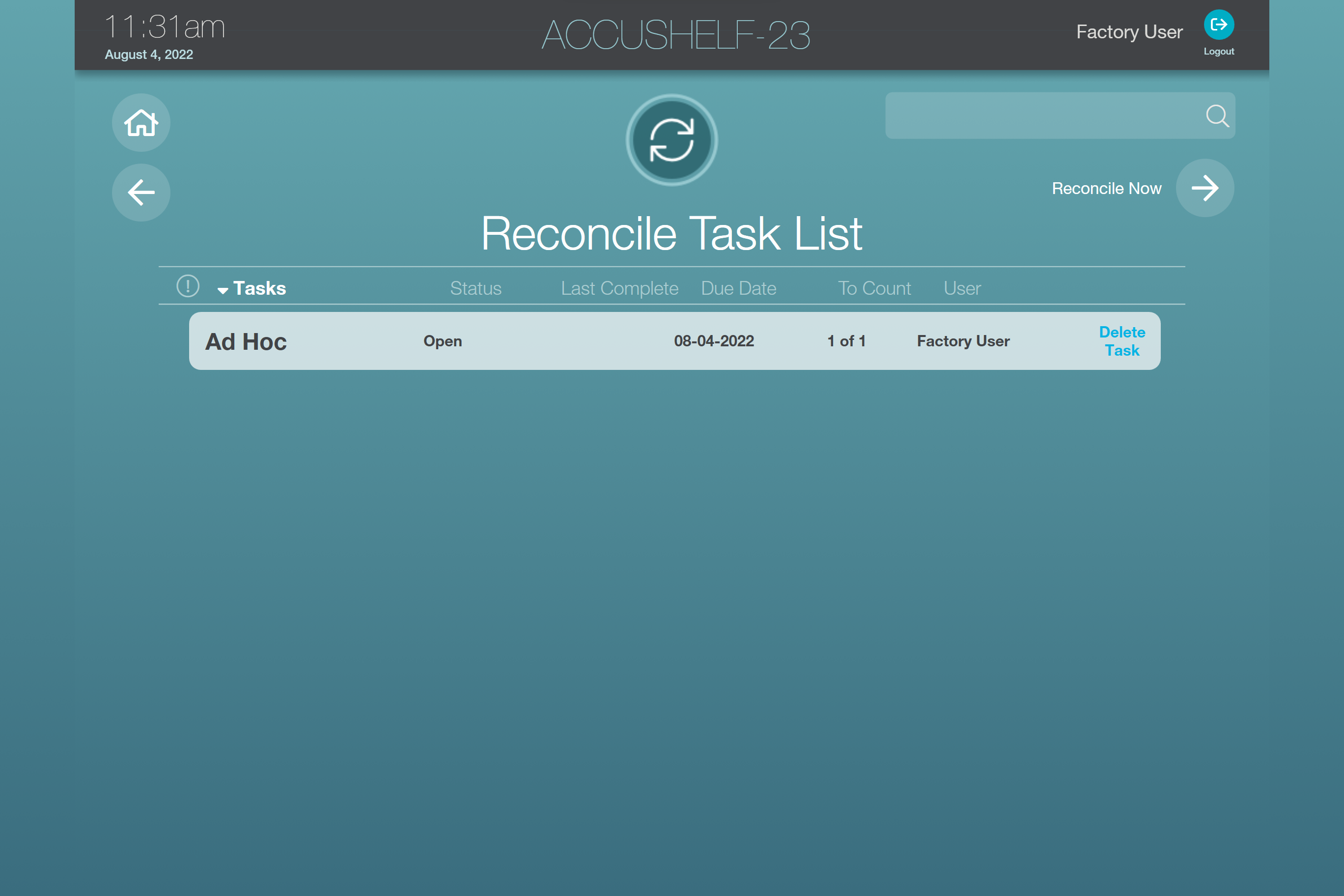 The Reconcile feature allows users to ensure that inventory counts on AccuShelf match the physical inventory on hand. AccuShelf tracks every transaction, but discrepancies in inventory counts can still occur if an item was not scanned, misplaced, etc. This process lets users update the AccuShelf inventory based on the physical item count, while tracking discrepancies along the way.
