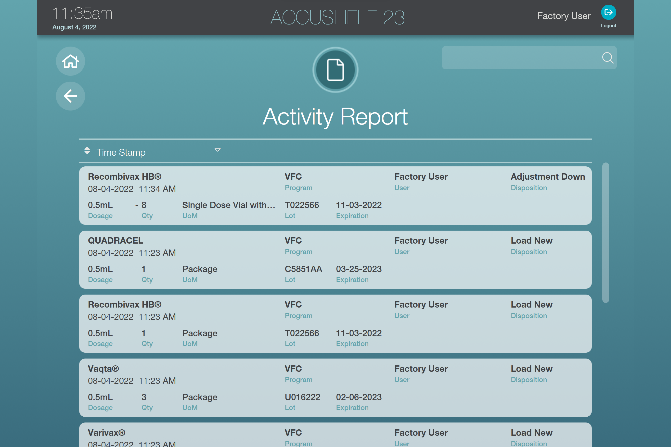 6. Once the submit button is pressed on the Reconcile Summary Report, both the inventory counts and task statuses will update. If every item in the task was not counted, the task will remain open with the non-reconciled items. If every item was counted, the task will be marked as completed. The activity will be logged in the Activity Report. To view this report, press “Inventory”. Press “Activity”.