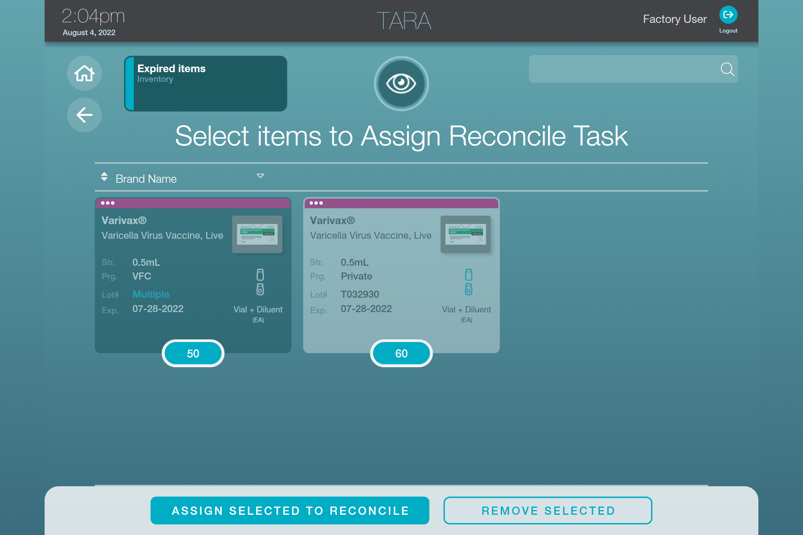 2. The screen will populate with the available inventory cards for expired items. Press the cards for items that you want to remove. They will turn to a darker shade of blue. Once the item(s) are selected, press the “Remove Selected” button.
