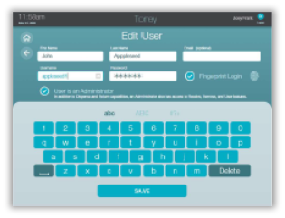The Edit User screen lets an Administrator make changes to a user’s first name, last name, email, username, password, permissions, and fingerprint login status. Once a change is made, the administrator can press the Save button at the bottom of the screen to confirm.