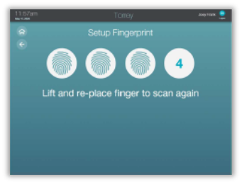 To capture a fingerprint, the user will place their finger on the scanner 4 times. Each time the fingerprint is captured, the AccuShelf will display the fingerprint image in the circle. Once all 4 captures are completed and saved, the user will be able to login via fingerprint scan. Note: the same finger must be used for all 4 captures.
